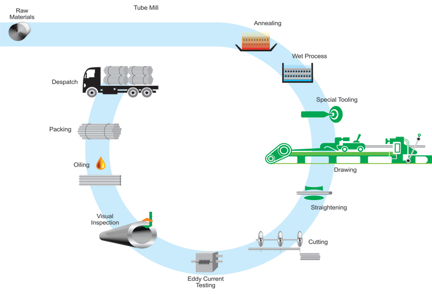 CDW tubes are customised products as required by customers for specific purposes wherein high precision, tolerance, tensile strength, mechanical enhancement, better surface finish, custom sizes and quantities etc are desired. Herein, the finished ERW tube is the starting raw material from which the CDW tubes are made. ERW tubes are subjected to processes like pickling, annealing, lubricating and swaging. Next, the desired size is attained by passing the tube through multiple drawing operations. A final round of visual and mechanical inspection is followed by oiling, packing and dispatch.